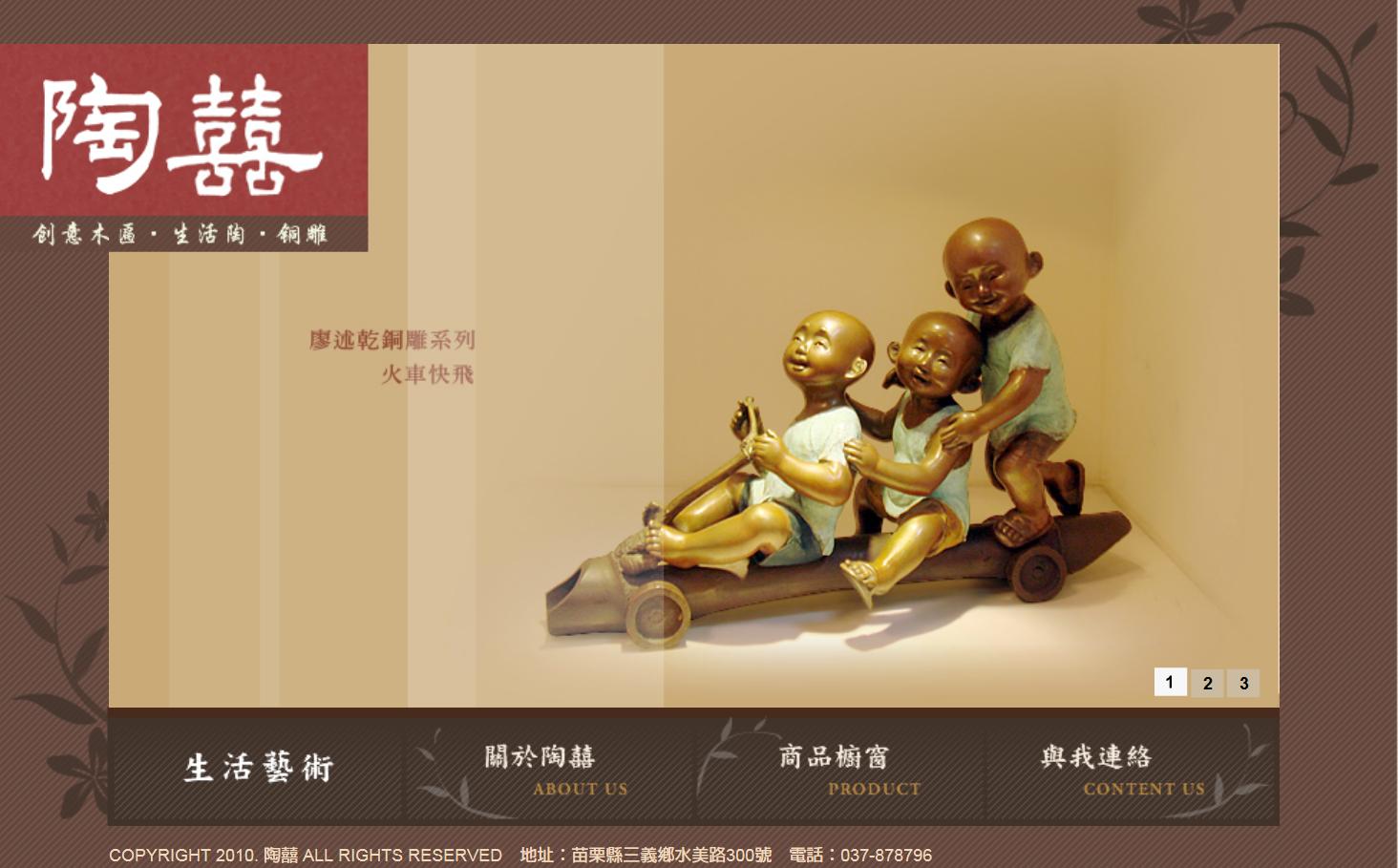 因為喜歡收藏一些藝術品並且對古董家具都有極高的興趣,所以成立了這家具藝術 風格及中國風的店---陶囍。 陶囍開在三義水美街上,店內有各式生活陶、古董家具、木材的作品、銅雕、花器 、作品琳瑯滿目、及收藏藝術家廖述乾的作品,是一家具有藝術氣息的店。 主要服務內容是以生活陶、銅雕、花器、老木或古董家具為主。